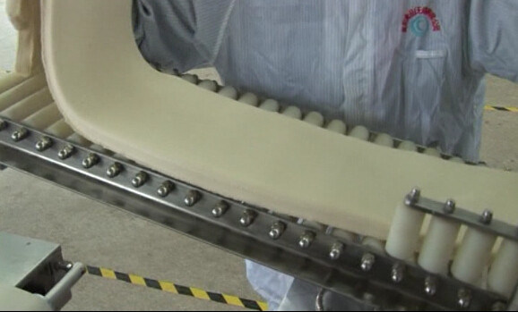 1) Het deeg wordt gekneed door het eerste rolwiel, waar u de dikte van het deeg kunt aanpassen, en gerold door roterende die rollen van twaalf rolwielen worden gemaakt en een rolwiel tussen haakjes van klappend beetje bij beetje het deeg te maken meer oppoetsen, zijn het gewicht en de kwaliteit stabiel. Dan gekneed door goed gevormd wiel dat de dikte van het deeg, volgens de eisen van de klant kan aanpassen.