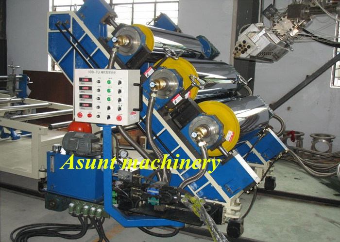 7. Deze lijn van de bladuitdrijving is uitgeruste 45 graad drie-rol calander, met hoge prestaties geluchte extruder, matrijs, het systeem van de het schermverandering, koelraket, afstand-van eenheid, scherpe eenheid en enz.