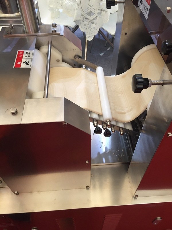 1) adonan diremas oleh roda roller pertama, dan Anda dapat menyesuaikan ketebalan adonan.